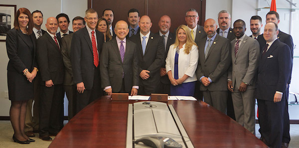 NATCA President Paul Rinaldi and FAA Administrator Michael Huerta were joined by NATCA Executive Vice President Trish Gilbert, FAA Air Traffic Organization (ATO) Chief Operating Officer (COO) Teri Bristol, NATCA’s Contract Negotiating Team; Eastern Regional Vice President and Chief Negotiator Dean Iacopelli, Phil Barbarello , John Bratcher (Fort Smith), Eddie De Lisle (Portland TRACON), Jamaal Haltom (Las Vegas Tower), Drew MacQueen (Cleveland Center), Special Counsel to the President Eugene Freedman (National Office), and Director of Labor Relations Ryan Smith (National Office); and the FAA Contract Negotiating Team; Chief Negotiator William L. Cound, Mohmad Danny Ahmad, Matthew Beck, Michael Doherty, Michael Doss, Steven T. Jackson, Shelly Mlakar, and Michael D. Williams.