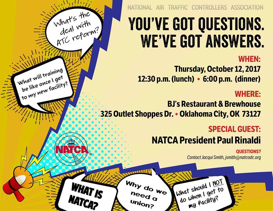 NATCA will be hosting a lunch meeting in Oklahoma City at 12:30 p.m. local time and a dinner meeting at 6 p.m. local time in Oklahoma City.
