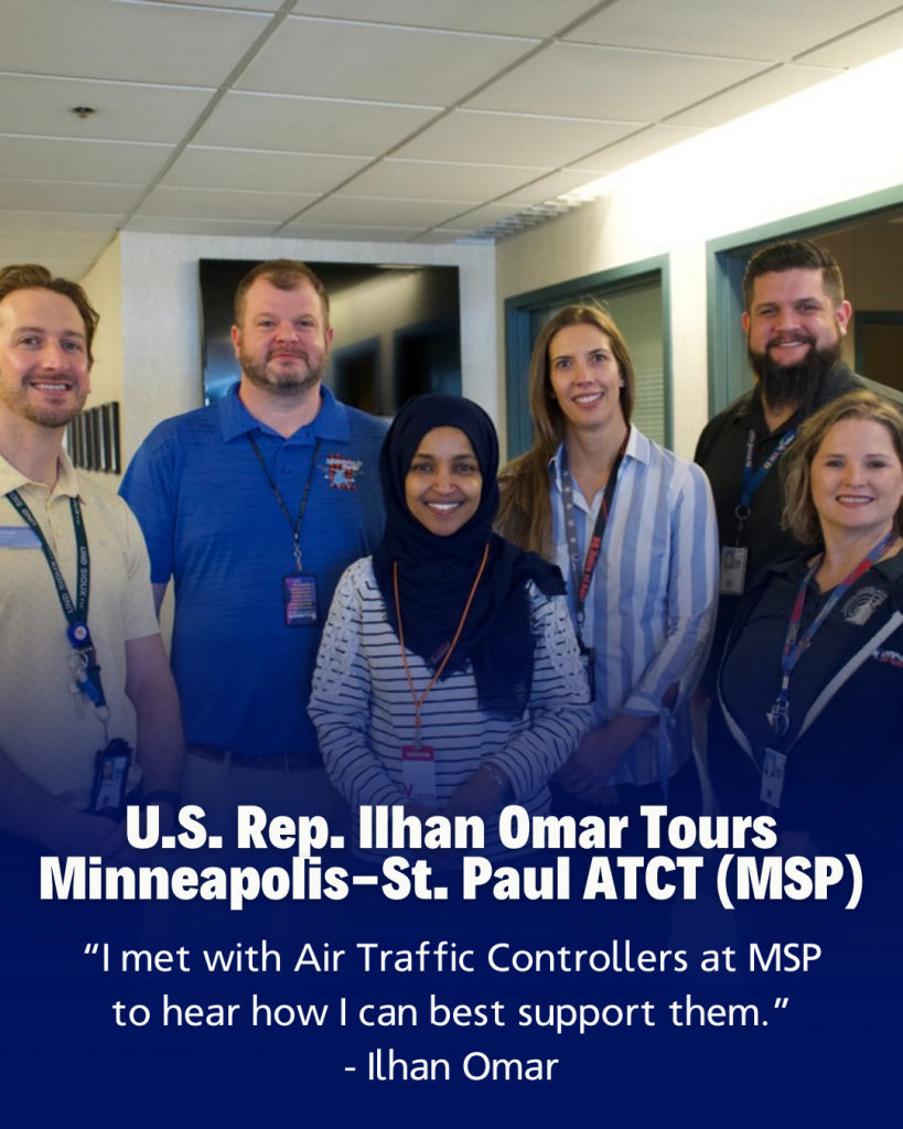 U.S. Rep. Ilhan Omar (Minn.-5) toured Minneapolis-St. Paul ATCT (MSP) where she heard from members first hand about what kind of support we need to do our jobs. Omar also spoke out against the firing of probationary FAA employees, represented by both PASS and NATCA.