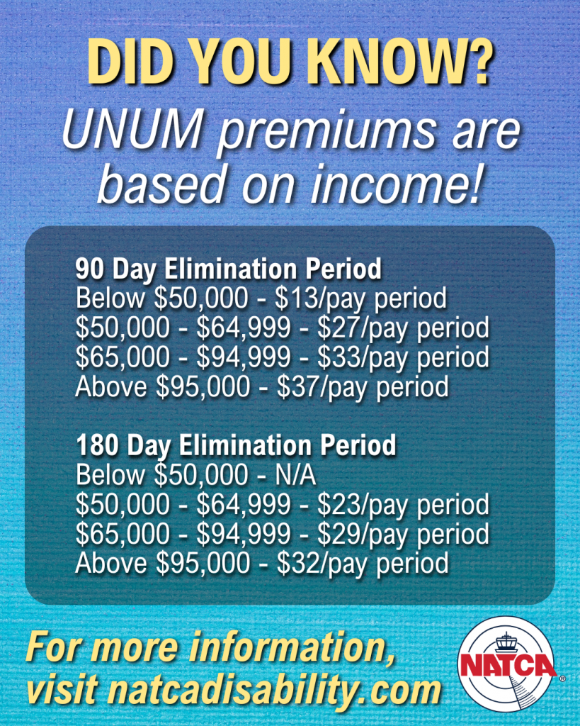 There is only one month left to enroll in NATCA’s exclusive Long-Term Disability Insurance plan with Unum. Unum is an affordable way to protect a large portion of your income that could be lost due to illness or injury. Premiums are based on your income and the elimination period you choose (90 or 180 days…